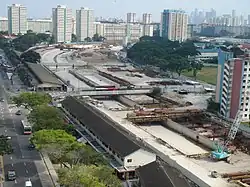 The Paya Lebar section continues from where the Kallang Section leaves off beneath the Kallang River and Pelton Canal past MacPherson Estate, comes to an interchange with Paya Lebar Road, Upper Paya Lebar Road, MacPherson Road and Airport Road, crosses over the Circle MRT line which was under construction at the same time as the expressway, and continues for almost three and a half kilometres underground beneath Airport Road and the Paya Lebar Air Base, emerges at ground level near Defu Lane 3, goes on an elevated interchange over Tampines Road. It meets Buangkok East Drive at an interchange[11] before continuing towards the existing Tampines Flyover to meet with Tampines Expressway. It replaces one of the fish farms at Tampines Road.