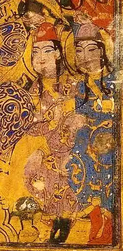 Prince with Turkic features and clothing (detail). Maqamat of al-Hariri 1334, probably Egypt.[4][5] Possible depiction of Sultan an-Nasir Muhammad,[6] who was himself of Kipchak (Turkic) and Mongol descent.[7]