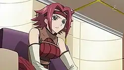 Kallen Stadtfeld (カレン・シュタットフェルト, Karen Shutattoferuto) is a fictional character in the Sunrise anime series Code Geass: Lelouch of the Rebellion. In the series, she is legally known as "Kallen Stadtfeld" at school, but prefers to be called by her original birth name and mother's surname, using Kallen Kozuki[1] (紅月カレン, Kōzuki Karen) during her revolutionary activities and life after the series concludes. Her Japanese voice actress Ami Koshimizu won "Best Actress in a Supporting Role" for her role as Kallen at the first Seiyu Awards in 2007.[2] Kallen was awarded 8th place in the 29th Anime Grand Prix,[3] then 17th and 16th, respectively, in the following two.