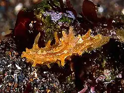 The living animal has a general orange coloration. The whole dorsum has brown dots except at the apices of the lateral appendages, which are pale yellow. These brown dots are similar and size and regularly distributed. The dorsum has an opaque white, irregularly shaped line, which runs from the front of the head to the posterior end of the notum. This line bifurcates at the level of the branchial leaves, where it surrounds them and remerges again behind the branchial leaves. The posterior end of the foot is thin and acute and has a yellow color similar to that of the lateral appendage apices. Two types of appendages are observed in the specimen. The first type of appendages is the longest and widest. There are three pairs of these lateral appendages situated along the margin of the sides. These appendages have a ramified apex. Each ramification of the apex has a rounded base and a long, thin and sharp prolongation. The whole length of each of these appendages is covered by little and acute ramifications. The second type of appendages, are thin, long with many small sharp, thin and long simple ramifications. These appendages are present on the sides of the body, foot, dorsum and oral veil in number 15–17 per side with 6 on the oral veil. The rhinophores have a lamellate clavus and a peduncule with little, thin and sharp ramifications. Each rhinophoral sheath edge has three ramifications. The middle one is virtually identical to the lateral appendages. The other two ramifications are similar to the smaller tentacles of the rest of the body. The oral tentacles are simple folds of the mantle that have a cylindrical shape. There are three tripinnate branchial leaves. They present long, simple, and thin ramifications as the smaller appendages.[1]