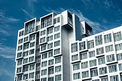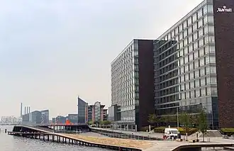 The raised promenade then continues to Tivoli Hotel and Congress Centre. The complex is designed by Kim Utzon Architects and comprises a conference venue with room for 4,000 people and two hotels. The Tivoli Hotel is currently under expansion.[5] Later stages will continue it southwards to Dybølsbro station and later all the way to the South Harbour. The terraced landscape that surrounds the SEB buildings were designed by Stig L. Andersson.[6]