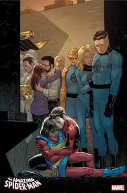 Kamala continued to appear in Zeb Wells and John Romita Jr.'s relaunched The Amazing Spider-Man vol. 5 (2022) as the personal assistant of Norman Osborn. The Direct commented that Kamala "has only appeared on 14 out of 646 pages and 37 out of 3204 comic panels of Wells' story thus far, which includes The Amazing Spider-Man #1-25, Dark Web #1, and Dark Web Finale #1".[140] Following a leak in May 2023, Marvel confirmed that Kamala will die in The Amazing Spider-Man #26 ahead of its publication on May 31.[16][141][142] In the issue, Kamala saves Mary Jane Watson from being sacrificed by the dimension-hopping Emissary by using her shapeshifting abilities to take on Watson's appearance. The Emissary attacks Kamala, assuming she is Watson, which botches the Emissary's ritual, and leads to his death. However, Kamala is unable to heal from the wounds sustained during that attack. Kamala reveals her identity to Peter before dying in his arms.[143][144][145]