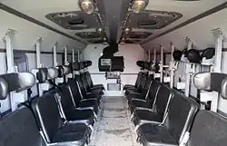 Seats are equipped with personal weapons holders, seat belts and head restraints. They are attached to the roof module, to reduce the impact of mines / bombs. Inside the module is installed set for filtering FVUA-100A and air conditioning. On the roof there are escape hatches in case the vehicle rolls over. Passengers exit through the ramp at the stern of the vehicle or through a side door.