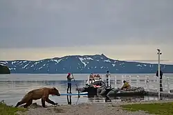 Kamchatka brown bears are generally not dangerous to humans. During a study on the animal, one researcher found that only 1% of his 270 encounters with Kamchatka brown bears resulted in attack.[9] Although surprised by the number and size of bears there, the first Europeans who went to Kamchatka in the 19th century observed that they were relatively harmless compared to their Siberian counterparts.[10] However, in July 2008, a platinum-mining compound in the Olyutorsky District of Kamchatka Krai was besieged by a group of 30 starving bears who killed two guards.[11]