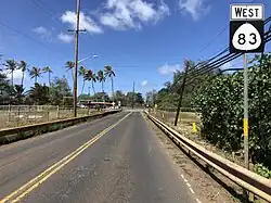 Originally, Kamehameha Highway continued as Route 83 at the junction with Route 99 at Weed Junction in Hale‘iwa, passing through Hale‘iwa up the North Shore. Since 1995,[2] Route 83 begins inland from Weed Junction as the Joseph P. Leong Highway and bypasses Hale‘iwa town on the inland side, rejoining Kamehameha Highway north of Hale‘iwa.