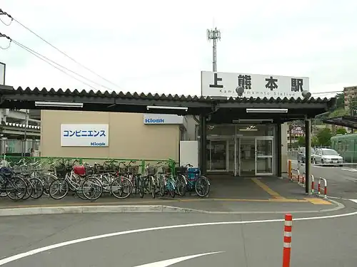 Kami-Kumamoto Station (上熊本駅, Kami-Kumamoto-eki) is a railway station in Nishi-ku, Kumamoto, Japan. It is on the Kagoshima Main Line of JR Kyushu and the Kikuchi Line of Kumamoto Electric Railway. In front of the station is a tram stop of the tram operated by Kumamoto City Transportation Bureau named Kami-Kumamoto-Ekimae Station.