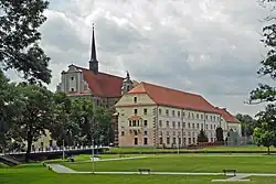 The architectural and landscape ensemble, containing the local landmarks, the abbey and palace, is a Historic Monument of Poland.[1]