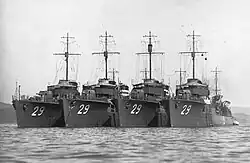 The Kamikaze-class destroyers (神風型駆逐艦, Kamikazegata kuchikukan) were a class of nine destroyers of the Imperial Japanese Navy.[1] Some authors consider the Nokaze, Kamikaze and Mutsuki classes to be extensions of the Minekaze-class destroyers, and the Kamikaze class is sometimes referred to as the "Kiyokaze class" to distinguish it from the earlier World War I-era destroyer class of the same name. Obsolete by the beginning of the Pacific War, the Kamikazes were relegated to mostly secondary roles. Most ultimately were lost to U.S. submarines.