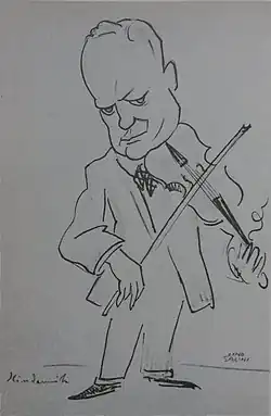 The concerto is dedicated to Arnold Mendelssohn ("Herrn Professor Arnold Mendelssohn gewidmet").[15] Mendelssohn, the son of cousin of Felix Mendelssohn, was his teacher at the Musikhochschule Frankfurt.[3] It was premiered at the Kroll Opera House in Berlin on 3 November 1927 by the Staatskapelle Berlin, conducted by Otto Klemperer, with the composer as the viola soloist.[3][15]