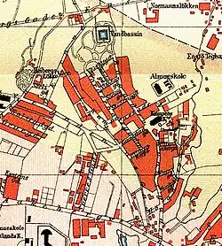 The name may come from kamp, meaning outcrop, though it may also come from a military campment. During the 18th century, the home guard had military practices at Kampen. The area belonged to the farms Bergsløkken and Oslo Ladegård, before being parcelled up in 1820. A wooden suburb was built between the city expansions—meaning acquisitions of territory belonging to Aker municipality—of 1859 and 1878. Part of the wooden housing burned down in 1879, and was replaced with brick block housing and Kampen Church. The northern part of Kampen has many brick buildings from the 1930s, though the wooden housing still dominates in other parts. There was a controversy related to demolition and rebuilding in Brinken during the 1980s.