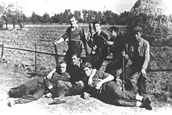 In the early years of the occupation, the underground activity in the VIII District mainly focused on gathering weapons and ammunition, conducting military training for sworn soldiers, intelligence work, and informational-propaganda activities.[12][13] Over time, sabotage-diversion actions were also organized, and traitors, informants, and common criminals were punished or eliminated.[14] For almost three years, the VIII District developed its underground activity without significant opposition from the Germans. However, with the increase in the number and activity of conspirators, the number of "leaks" and arrests also increased. Inevitably, there were losses during combat actions.[15] The conditions of underground work deteriorated significantly from June 1943 when a unit of German gendarmerie specialized in combating the resistance movement was quartered in Zaborów.[16] In November 1943, as a result of betrayal by one of the conspirators, dozens of people – soldiers of the VIII District and members of their families – were arrested. Eight residents of Truskaw and Izabelin were then burned alive by Zaborów gendarmes. As a result of the series of arrests, the 1st and 5th companies of the VIII District suffered such heavy losses that it became necessary to merge them into one company.[17][18] On 28 January 1944, a clandestine weapons depot located in the Opaleń forest fell into the hands of the Germans.[19] Another severe blow was the death of the commander of the Kedyw of the VIII District, Second Lieutenant Marian Grobelny, alias "Macher", and four other soldiers shot by Zaborów gendarmes in an ambush near Sieraków (24 June 1944).[19]
