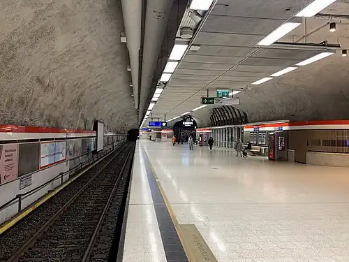 The Kamppi metro station was built with a secondary platform located perpendicularly under the one in use, reserved for a future metro extension.[10][11][12][13] The hall was dug in the 1970s in connection to the construction of the current station as it was cheaper this way. The bottom of the hall is about thirty metres below sea level, about fifteen metres below the current platform hall. This secondary platform hall is not equipped in any way. The hall is designed to allow metro trains to travel perpendicular to the trains on the current metro level. The hall can currently be accessed by a spiralling staircase leading down from an exhibition showcase in the centre of the current station platform. If the second platform hall is ever taken into use, a set of escalators will be installed at the same spot. The second platform hall has effective air conditioning intended to remove the radon gas leaking to the space from the rock walls.[14]