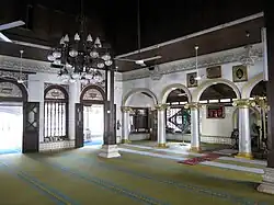 The mosque also has a blend of English and Portuguese glazed tiles, Ionic columns with symmetrical arches in the main prayer hall, a Victorian chandelier, a wooden pulpit with Hindu and Chinese-style carvings, and Moorish cast iron lamp-posts in the place of ablution for pre-prayer cleansing. The Department of Museums and Antiquities completed conservation works on the mosque in the 1990s.