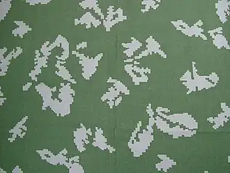 Birch camouflage is 2-color design and consists of light angular ("toothed") spots in the shape of leaves on a green-olive background.[9] The standard camouflage pattern exists in two color versions: with spots of light gray color; with spots of yellow-sand color (this version was used mainly by KGB border guards). The background color of both variants is olive, sometimes there are swamp-colored specimens. In any case, the background in this color scheme is always darker than the spots. The spots themselves have "angular" edges consisting of many small squares. The KLMK is made with a digitalized spatter-like pattern.[10]