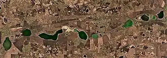 Kamysty is an endorheic lake of the Ishim river basin. It lies at the southern edge of the Ishim Plain in the Kamyshlov Log, an alignment of disconnected lakes which is the bed of an ancient river. With a length of over 8 kilometers (5.0 mi) Kamysty is the largest of the lakes in the tract between Petropavl city in Kazakhstan and Isilkul town in Russia. This stretch is roughly aligned from west to east with lake Polovinnoye 2.5 kilometers (1.6 mi) to the west and Bolshoye Solenoye 5 kilometers (3.1 mi) to the east of Kamysty.[3][1][2]
