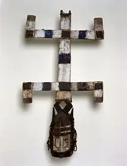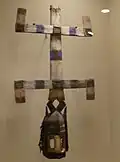 The base wooden mask is worn on the face and is topped with a tall, two-barred cross,[1] with the wooden crossbars being of equal length The lower of the two has its ends pointing down, while the upper has its ends pointing up.[1] The entire mask can be over 3 feet (0.91 m) tall; the dimensions of one example are 43 1/16 × 24 3/8 × 6 15/16 inches (109.3 × 61.9 × 17.7 cm).[3]