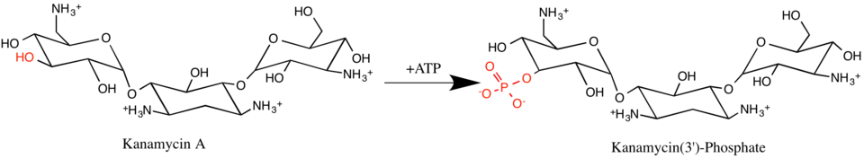Aminoglycoside-3'-phosphotransferase (APH(3')), also known as aminoglycoside kinase, is an enzyme that primarily catalyzes the addition of phosphate from ATP to the 3'-hydroxyl group of a 4,6-disubstituted aminoglycoside, such as kanamycin.[2] However, APH(3') has also been found to phosphorylate at the 5'-hydroxyl group in 4,5-disubstituted aminoglycosides, which lack a 3'-hydroxyl group, and to diphosphorylate hydroxyl groups in aminoglycosides that have both 3'- and 5'-hydroxyl groups.[2][3] Primarily positively charged at biological conditions, aminoglycosides bind to the negatively charged backbone of nucleic acids to disrupt protein synthesis, effectively inhibiting bacterial cell growth.[4] APH(3') mediated phosphorylation of aminoglycosides effectively disrupts their mechanism of action, introducing a phosphate group that reduces their binding affinity due to steric hindrances and unfavorable electrostatic interactions.[5] APH(3') is primarily found in certain species of gram-positive bacteria.[6][7][8]