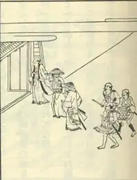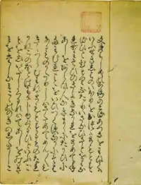 Famous kanazōshi writers include Asai Ryōi (d. 1691) and Suzuki Shōsan (1579-1655). Main works include: Nise Monogatari (Tale of Falsehoods: A Parody of Tales of Ise), Shimizu monogatari (Tale of Shimizu), and Tōkaidō meishoki (Famous Sites on the Tokaido Highway). The most celebrated example of the genre is Ryōi’s Ukiyo monogatari (Tales of the Floating World, 1661), a comedic tale about a young man named Hyōtarō who gets himself into all kinds of trouble with gambling, prostitutes, and the like, and then learns valuable lessons about the proper way to live one’s life from town elders. One translation from Europe was distributed as kanazōshi – a three-volume edition of Aesop's Fables, from 1593, entitled Isopo Monogatari (伊曾保物語).[1] This was the sole Western work to survive in later publication after the expulsion of Westerners from Japan.[2]