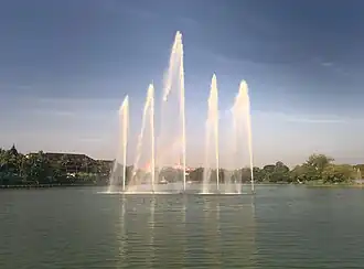 Kandawgyi Lake (Burmese: ကန်တော်ကြီး pronounced [kàɰ̃dɔ̀dʑí]; lit. 'great royal lake'), is one of two major lakes in Yangon, Myanmar. Located east of the Shwedagon Pagoda,[1] the lake is artificial; water from Inya Lake is channelled through a series of pipes to Kandawgyi Lake.[2] It was created to provide a clean water supply to the city during the British colonial administration.[3][4] It is approximately 3 miles (4.8 km) in circumference, and has a depth of 20–45 inches (510–1,140 mm).[5]