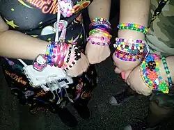 A kandi bracelet is a type of bracelet usually made out of pony beads, and is a popular type of attire in scene or rave culture, particularly kandi culture. Kandi bracelets are traditionally handcrafted, and some view store-bought kandi bracelets as diminishing their meaning of 'unity'.[1] They are frequently made with rainbow or lettered beads.[2]
