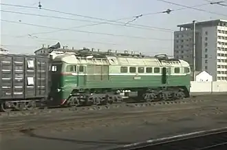 As a result, in 1998 the Kim Chong-t'ae works began a program to convert the more decrepit M62-type diesels in the KSR's inventory to electric operation.[2] This was achieved by removing the diesel engine, fuel tanks and other unneeded equipment, and the installation of the necessary transformers and related gear to convert the power collected from the overhead lines, via newly-installed pantographs, to the traction motors. The resulting unit is considerably lighter than the diesel version, and sound like oversized streetcars.[1] Like the original diesels, these produce 1,470 kilowatts (1,970 hp), making suitable for the same services as the diesels.[6]