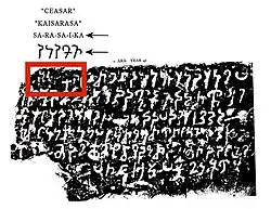 In an inscription dated to the "Year 41" (probably of the 2nd century of the Kanishka era) and discovered on the borders of the river Ara in Punjab, he qualifies himself as a Maharaja rajadhiraja Devaputra Kaisara Kanishka ("Great King, King of Kings, Son of God, Caesar, Kanishka), suggesting some awareness of the Roman Empire as Kaisara seems to stand for "Caesar", and names himself as the son of Vajheshka, identified as Kushan ruler Vashishka.[3][4][5] The inscription is rather worn and the reading Kaisara has been doubted, especially since no other mentions of this title are known from Kushan sources.[6]