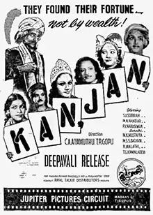 Kanjan (transl. Miser) is a 1947 Indian Tamil-language film directed by Covai A. Aiyamuthu and T. R. Gopu.[2] The film stars S. V. Subbaiah, R. Malathi and T. G. Kamala Devi. No print of the film is known to have survived, and it is considered a lost film.[3]