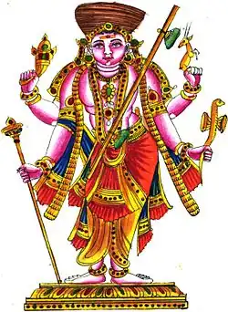 Kankalamurti (Sanskrit: कङ्कालमूर्ति, romanized: Kaṅkālamūrti, lit."skeleton form"), also known as Kankala ("skeleton") or Kankala-Bhairava, is an iconographical form of the Hindu god Shiva. He is often associated with a fearsome aspect of Shiva, Bhairava, and also considered to be the latter's aspect. Kankalamurti is popular in South Indian temples of Shiva, but almost unknown in North India. He is described in legends to have defeated and slayed Vishnu's army-chief and gate-keeper Vishvaksena or Vishnu's avatar Vamana. He is depicted as a four-armed man with a kankala-danda (skeleton-staff) in his hand and followed by bhuta ganas (ghostly attendants) and love-sick women.