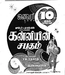 - ^ a b c d "1958 – கன்னியின் சபதம் – ஜூபிடர் புரொடக்சன்ஸ்" [1958 – Kanniyin Sabatham – Jupiter Productions]. Lakshman Sruthi (in Tamil). Archived from the original on 2 June 2017. Retrieved 2 June 2017.