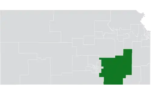 The district overlaps with Kansas's 2nd and 4th congressional districts, and with the 12th, 13th, 75th, 76th, 77th, and 79th districts of the Kansas House of Representatives.[4] It borders the state of Oklahoma.[1]