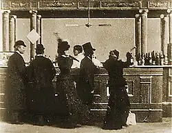 With production supervised by James H. White,[7] Porter was assisted by George S. Fleming during the creation of Kansas Saloon Smashers. Fleming was an actor and scenic designer at Edison Studios, who had joined the studio in January 1901.[8] Porter operated the camera for the film, and also developed the footage.[9] Kansas Saloon Smashers marked one of the first short films to be created under Fleming and Porter's partnership.[8] While none of the identities of the people who appeared in the picture are recorded,[1] it is known the women in the film were played by men in drag, rendering them sexually unattractive.[10]