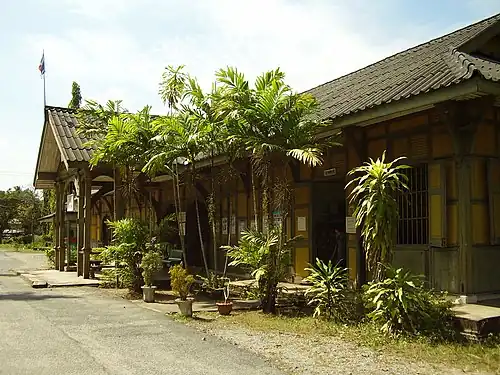 Kantang railway station is a railway station in Kantang Subdistrict, Kantang District, Trang. A Class 3 station, it is 850.082 km (528.2 mi) from Thon Buri railway station, and is the terminus of the Kantang Branch Line. Its building has not been renovated, and has its original wood designs. It is separated into two parts, the main building, and the verandah (platform). Both are painted mustard yellow lined in dark brown, a unique feature of the station. It contains Love Station, an air-conditioned coffee shop with a photogenically popular exterior.[1] Kantang Station's architecture has been preserved and registered under the Fine Arts Department. A formerly modern-style passenger train, permanently exhibited behind the normal tracks, can be seen from the station building and as one approaches by road.