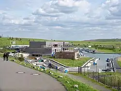 Kanupark Markkleeberg, built in 2006, is the second of two artificial whitewater canoe/kayak slalom courses in Germany, and the only one powered by pumps. The other German course is the Eiskanal in Augsburg, used in the 1972 Summer Olympic Games in Munich. Kanupark Markkleeberg is located on the southeast shore of Markkleeberger See, a lake south of Markkleeberg, a suburb on the south side of Leipzig. A former open-pit coal mine, the lake was flooded in 1999 with groundwater and developed as a water recreation area.[1] The lake is part of the Leipziger Neuseenland, the largest landscape construction project in Europe, which is reclaiming formerly barren industrial and mining sites for recreational use.