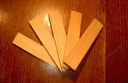 Kapla is a construction set for children and adults. The sets consist only of identical wood planks measuring 11.7 cm x 2.34 cm x 0.78 cm. This 15:3:1 ratio of length:width:thickness is different than the dimensions used for traditionally proportioned building blocks (such as unit blocks), and are used for building features such as lintels, roofs and floors. They are known for their stability in the absence of fastening devices.[1]