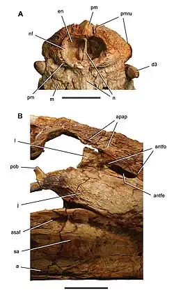 The surfaces of the premaxillae are rugose with the edges elevated above the body of the bone, suggesting that a keratinous shield would have been supported by the rugosities at the tip of the snout. Along the interpremaxillary suture, the area where the two premaxillae meet, the surface is smooth, giving the paired rugosity of the premaxillae the resemblance of a moustache in anterior view.