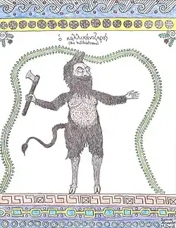There is no standard description of the appearance of kallikantzaroi; there are regional variations as to how their appearance is described. Some Greek illustrators have imagined them with some animal parts, such as hairy bodies, horse legs, or boar tusks. Sometimes they are enormous, at other times diminutive. Other groups see them as small humans with a horrible odor. They are predominantly male, often with protruding sexual characteristics.[1] Many Greeks have imagined them as tall, black and hairy, with burning red eyes, goats' or donkeys' ears, monkeys' arms, tongues that hang out and heads that are huge.[4] Nonetheless, the most common belief is that they are small, black creatures, humanoid apart from their long black tails, and said to resemble little black devils. They are also mostly blind, speak with a lisp and love to eat frogs, worms, and other small creatures.[5]