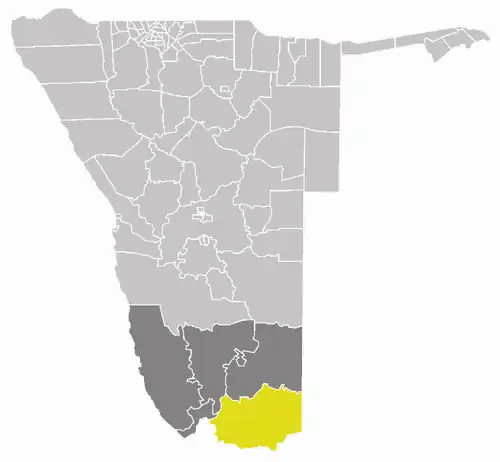 Karasburg was an electoral constituency in the ǁKaras Region of Namibia. It had a population of 16,470 in 2011, up from 15,758 in 2001. The constituency covered an area of 38,329 km2 (14,799 sq mi).[1] The main towns were Karasburg and Grünau; other populated places included Warmbad and Aussenkehr, and the border settlements of Ariamsvlei and Noordoewer. The Orange River formed part of the southern border of this constituency.[2] Economic activities in this constituency were mainly small-stock farming, and near the Orange River, grape production.[2]