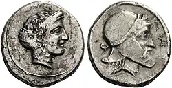 In 333 BCE, just before the battle of Issus, Alexander the Great sacrificed here at a temple that, by interpretatio graeca, he took to be of Athena; the "Athena of Magarsos" who appears on Hellenistic coins has been diagnosed, from her pose and the attributes that surround her, to have Mesopotamian connections.[5] Robin Lane Fox[6] recognizes the origin of the cult site in the victories of Sennacherib, who instituted the shrine in 696 BCE following a sea battle with Greeks off the mouth of the river;[7] he dedicated it to his martial goddess, Anat, or Ishtar.