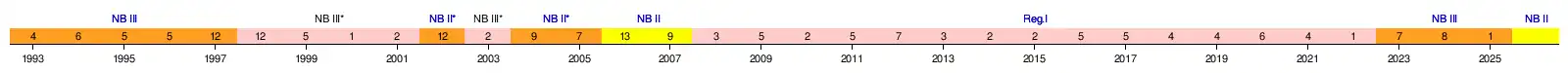 | NB III | ?. | 2022–23 | 38 | 17 | 7 | 14 | 58–51 | +7 | 58 | 7th | DNQ | Did not qualify | [8] | ||