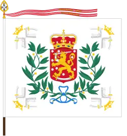 The flag of the brigade is the old flag of the Regiment of the Karelian Guard, designed by Carolus Lindberg. It consists of the Finnish coat of arms in the middle of an open laurel wreath. Each of the corners are decorated with the dueling arms from the coat of arms of the Province of Karelia with crowns. The flag is carried on a pole with the Cross of Liberty as a finial, and ribbons of the Cross of Liberty 4th Class. The ribbons are embroudered with names of locations where the original regiment saw combat during the Finnish Civil War.[4]
