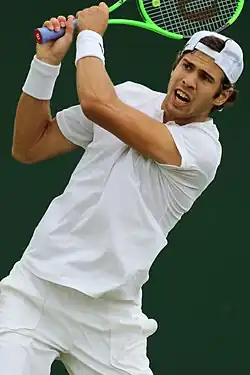 He continued with good performances, reaching the semifinal of the Halle Open. There he achieved his first win on grass over Gilles Simon,[10] and then recorded his second career top 10 win, after defeating Kei Nishikori. He lost to Roger Federer and failed to reach the final. This result ensured him a first Grand Slam seed place at the following Grand Slam at Wimbledon. There, he also had another great result, reaching his first third round, after wins over Andrey Kuznetsov and Thiago Monteiro. He then lost to Rafael Nadal.[11] His successful journey then continued with two consecutive quarterfinals at the Båstad Open and the Hamburg Open. However, he then started to struggle with form. He was eliminated in the first round at both the Canadian Open and the US Open, but reached the third round of the Cincinnati Open. In September he played in the Davis Cup for the second time in a year. He played against Hungarian players, winning against Attila Balázs and losing to Márton Fucsovics. He then went to China, reaching the second round of the Chengdu Open and the China Open and losing in the first round of the Shanghai Masters. He then returned to Europe, but still with no success, with only first rounds of the Vienna Open and the Paris Masters. He finished the year with his debut at the Next Gen ATP Finals. He overcame Jared Donaldson, but lost to Daniil Medvedev and Borna Ćorić, so failed to pass the round robin group.