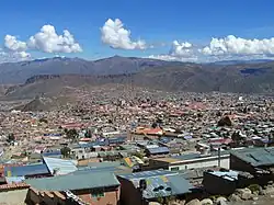 The Cordillera Andacaba area in the southern caldera is the site of several mining districts, which include lead-zinc or tin rich areals.[15] The Kumurana mine is located in the southern part of the caldera,[16] its mineralization occurred at temperatures of 213–413 °C (415–775 °F).[17] The Cerro Rico stock has been extensively hydrothermally modified and a number of minerals are found there. It was a major source of silver for Spain in the 16th and 17th century. Mining has been ongoing for over 450 years. Starting from 1912 tin has been mined as well.[9] Other mines in the dome are Lord Byron, Carandaiti, Mazuni, Illimani and Chaquirana.[3]