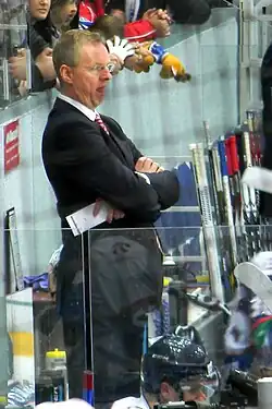 He was appointed head coach of Finland's national team in 2014. In April 2016, he was named head coach of SC Bern of the Swiss top-flight National League A (NLA).[1] He guided the Finnish national team to a silver medal at the 2016 IIHF World Championships in Russia[2] before stepping aside to take on the Bern job.[3] He guided Bern to the Swiss championship in his first year in charge (2017)[4] and also in 2019. On January 28, 2020, Jalonen was fired by SC Bern, following bad results. Hans Kossmann took over at the helm of the team. Bern was ranked 9th in the Swiss championship when Jalonen was sacked.[5] In March 2022, Jalonen signed a head coaching contract with the Czech national team until May 2024.