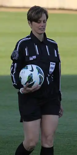 Kari Seitz is an American professional soccer referee and the most experienced female referee in the world (out of the male and female referees).[1] She participated in four FIFA Women's World Cup tournaments in (1999, 2003, 2007 and 2011), as well as four Olympic soccer tournaments (2004, 2008, 2012 and 2016) and is the only referee — man or woman — to do so.[2][3][4]