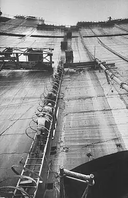 The dam was constructed on the orders of the Government of the Federation of Rhodesia and Nyasaland, a 'federal colony' within the British Empire. The consulting engineers Gibb, Coyne, Sogei (Kariba) (PVT.) Limited, a joint venture of consulting engineers, which included Sir Alexander Gibb & Partners, whose team was led by Sir Angus Paton,[2] and Coyne et Bellier, whose team was led by André Coyne.[3] The double curvature concrete arch dam was constructed between 1955 and 1959 by Cogefar-Impresit of Italy[3] at a cost of $135,000,000 for the first stage with only the Kariba South power cavern. Final construction and the addition of the Kariba North Power cavern by Mitchell Construction[4] was not completed until 1977, due to largely political problems, for a total cost of $480,000,000. During construction, 86 construction workers lost their lives.[3][5]