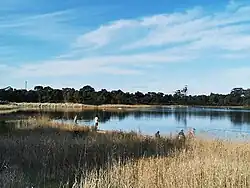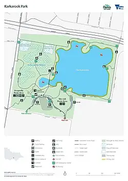 Karkarook Park is a metropolitan park in Melbourne, Victoria, Australia, located at the northwest corner of the southeastern suburb of Heatherton (formerly under Moorabbin), southeast of the intersection between Warrigal Road and Dingley Bypass, accessible to cars only via Fairchild Street on the south side. The park is a wetland reserve built around the Karkarook Lake, a 15 hectares (37 acres), 420 m (1,380 ft) wide artificial lake built from a pit created by sand mining between 1997 and 2001,[1] filled in 2004 by groundwater pumped from a bore 500 metres (550 yd) to the southeast.[2]