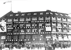 Constructed in 1912 as a factory, the building was purchased by the Communist Party of Germany (Kommunistische Partei Deutschlands, KPD) in 1926. It became the seat of its Central Committee and was named in honor of Karl Liebknecht, the KPD leader who was murdered by a paramilitary unit in January 1919. After Adolf Hitler was appointed as German chancellor, the Berlin police raided the headquarters, and by March 1, the Nazi swastika flag was flying over the building. Renamed the Horst Wessel House, the building at first served as a district police station and detention center in which Jews and political opponents were tortured. In 1935, the finance department of the state of Prussia moved into the building.