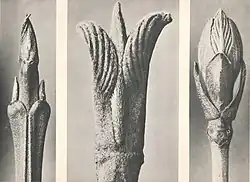 Blossfeldt's photographs gained popularity due to his unique artistic style, which set him apart from other notable photographers at the time.[14] Blossfeldt's focused and magnified photos were in stark contrast to the purposefully blurry images most photographers were producing at the time.[14] There were many characteristics of Blossfeldt's photographs that made them easily distinguishable; one being Blossfeldt's use of nature as his subject.[12] Blossfeldt spent large amounts of time in nature in his youth which was a large source of inspiration.[11] Blossfeldt held a deep appreciation for the scientific accuracy of his photographs as well as for nature so he rarely altered his natural subjects.[13] He stated that "The plant must be valued as a totally artistic and architectural structure."[9][15] Blossfeldt also maintained a detailed log of both the common and Latin names of his plant subjects.[13]