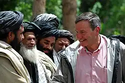 His first tour in Afghanistan, from September 2002 to September 2003, he filled two positions—his primary duty was as the U.S. security coordinator for Afghanistan and the second position was the chief of the Office of Military Cooperation-Afghanistan (OMC-A). As the security coordinator, he worked closely with special representative of the UN Secretary-General for Afghanistan and Pakistan Lakhdar Brahimi to forge a unified international effort to build a cohesive security sector. Security sector reform (SSR) followed a lead-nation approach agreed upon in January 2002, in which the G8 nations would each lead a specific sector—the United States was responsible for the Afghan National Army; Germany, the Afghan Police; UK, counter-narcotics; Italy, judicial reform; and Japan and the United Nations took on the task of disarming, demobilizing, and reintegrating the militias.[13]