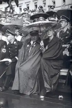 ![]() (from left) Philipp Bouhler, Karl Freiherr Michel von Tüßling (center), Robert Ley with his wife Inga; Munich, July 1939 | |